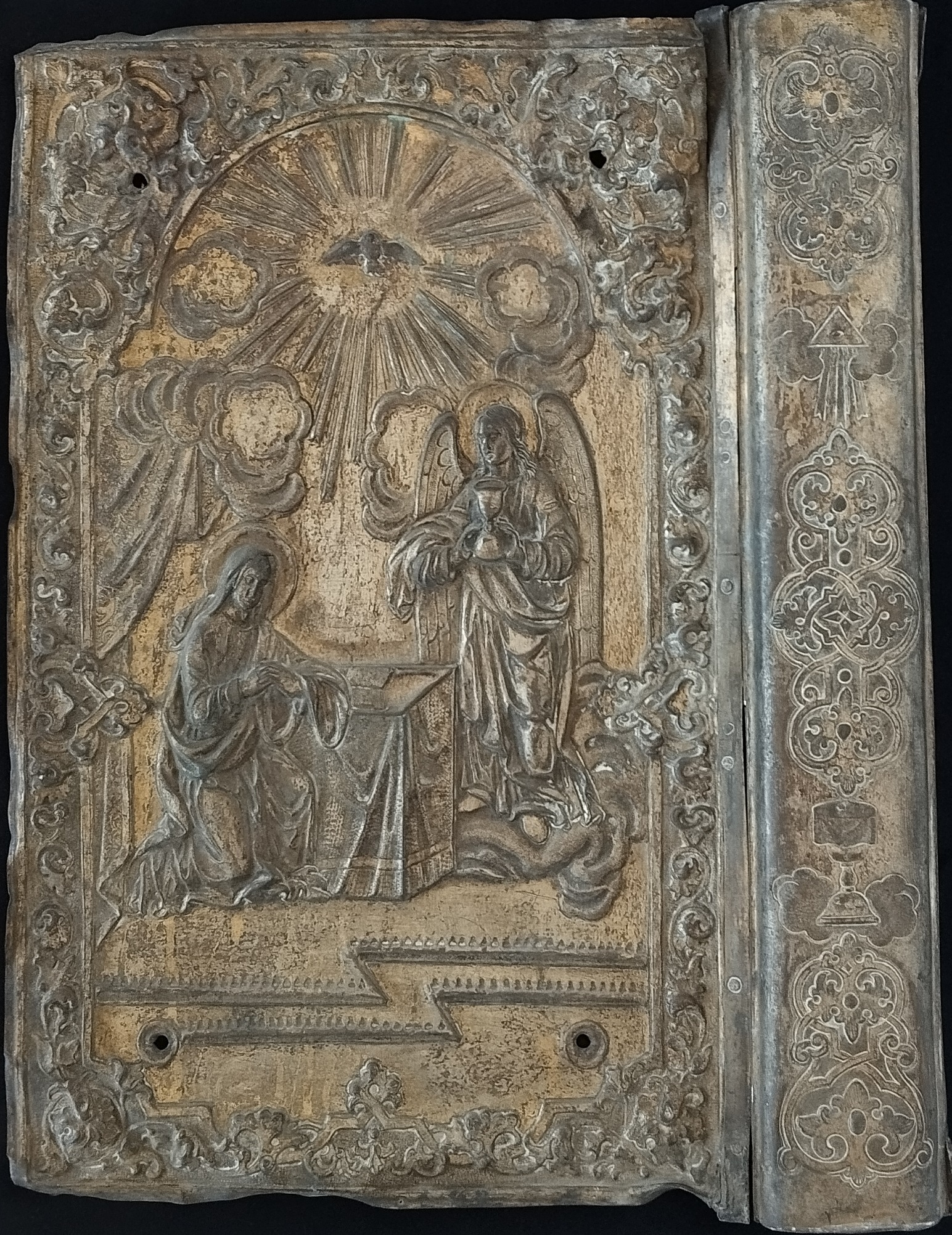Back plate and spine of a binding (of a religious book) depicting the scene of the Annunciation. The metal sheets (fixed by rivets) are embossed and the back plate have four fixing holes. Deformed, locally torn, abraded on the reliefs, heavily tarnished but showing a yellowish metallic appearance and traces of greenish and whitish compounds in hollows.
