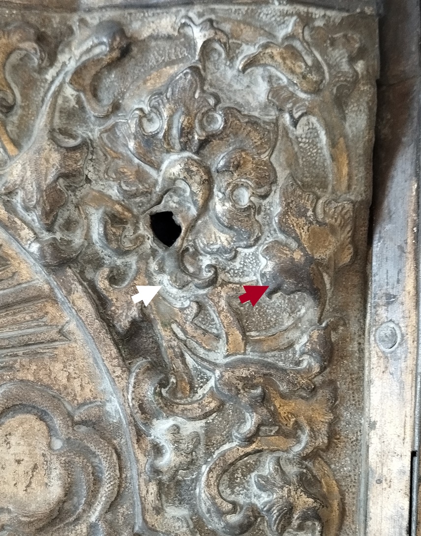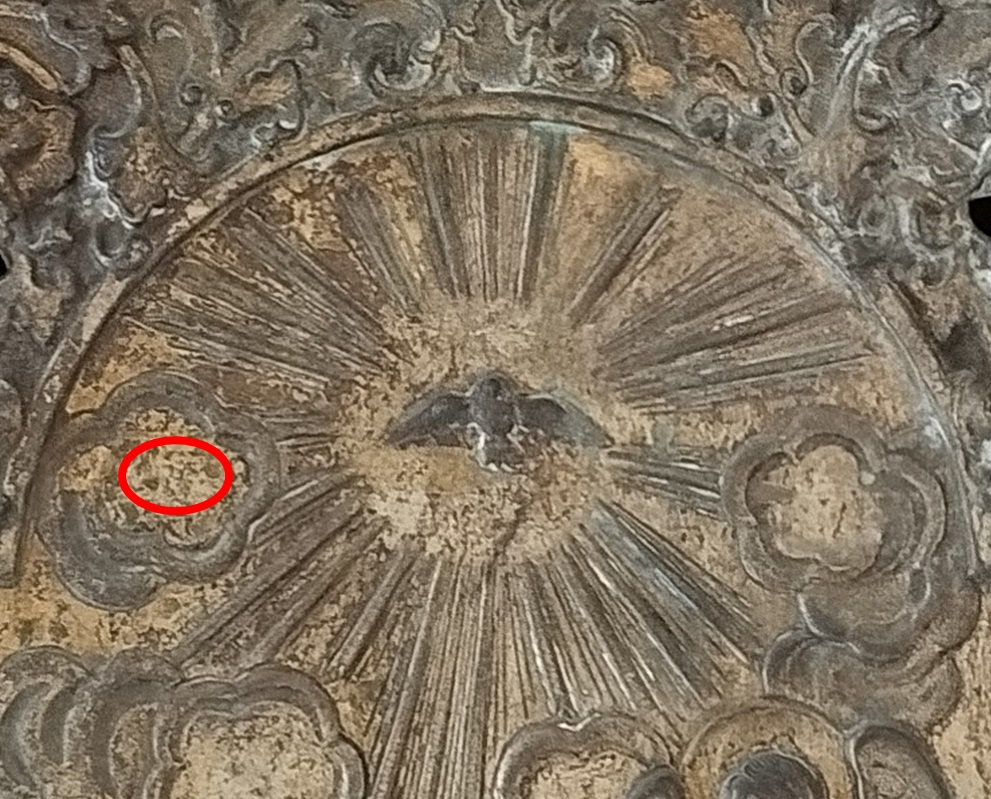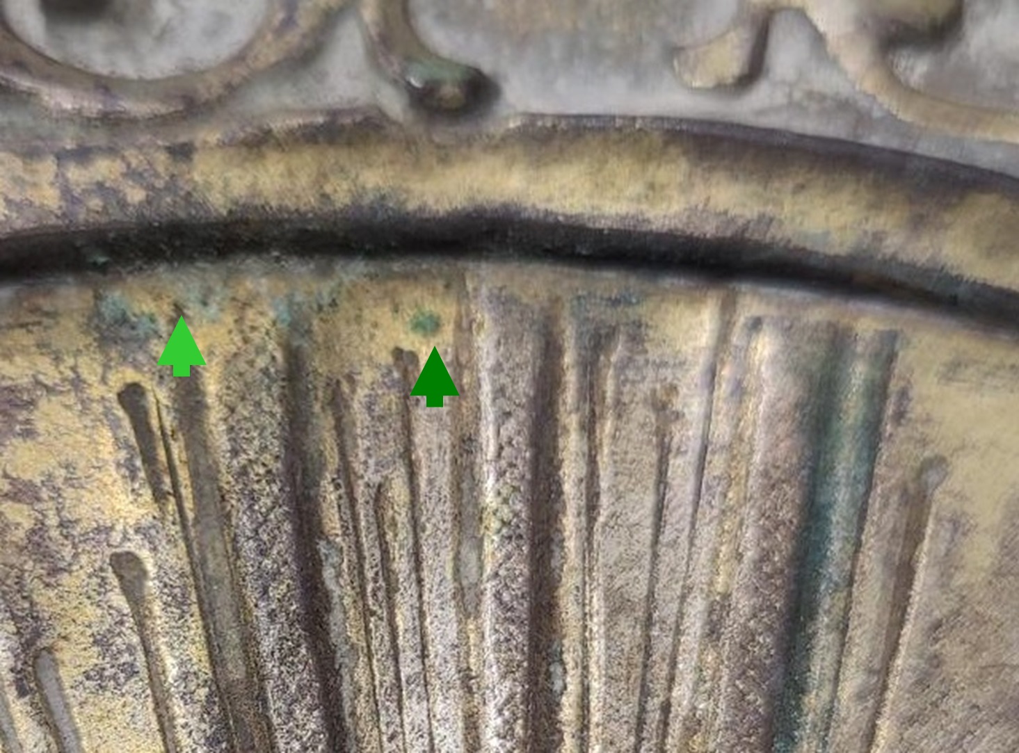 As mentioned before, the metal surface is heavily tarnished. Greenish compounds can be found locally, while and whitish compounds are usually found in hollows.