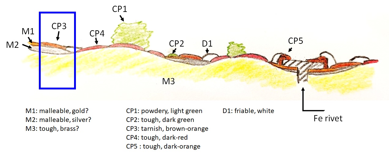 Results of the area observed indicate that the metal sheets are made of brass. The presence of Ag and Au seems to validate the hypothesis made in Fig. 5 and represented on the stratigraphy of Fig. 6.